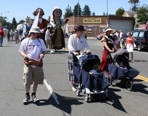 Lead puppeteers Fred and Kevin from Fratello Marionettes guide the new puppeteers with the giants. At right is Gwyneth on Benica's hand, and Nancy in a boat.